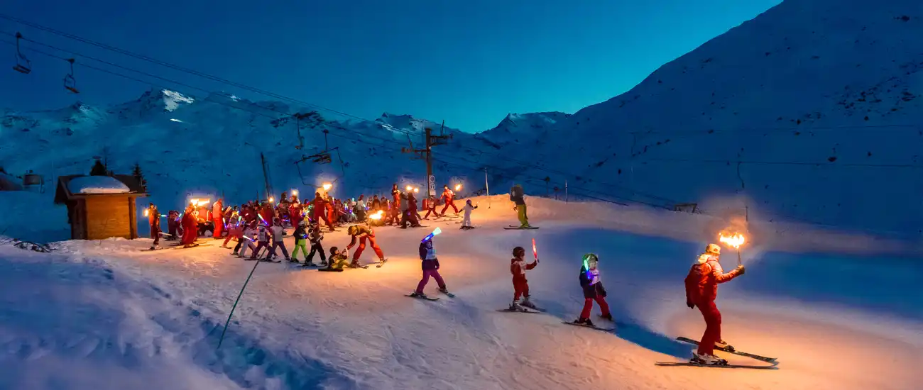The torch-lit descent is an unmissable ESF tradition. Every year, the instructors descend the slopes at the end of the day, after dark, carrying torches of light to put on an unforgettable show for young and old alike.